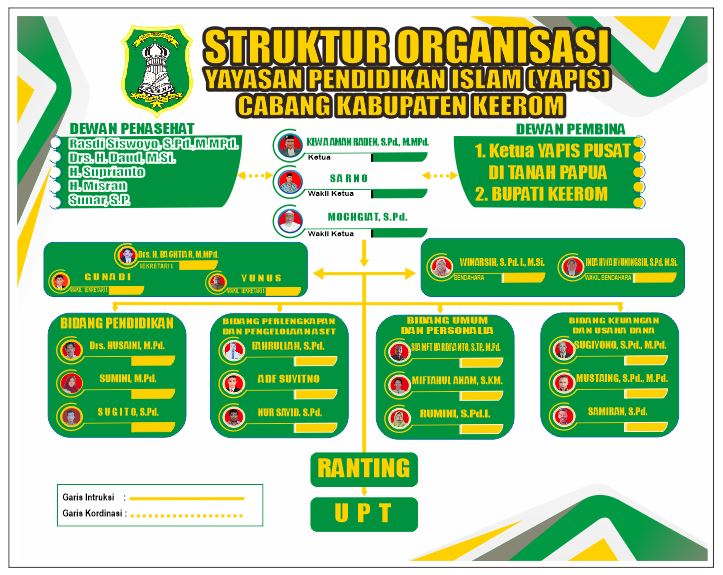 Berikut adalah Susunan Pengurus Yayasan Pendidikan Islam (Yapis) Di tanah Papua Cabang Kabupaten Keerom :